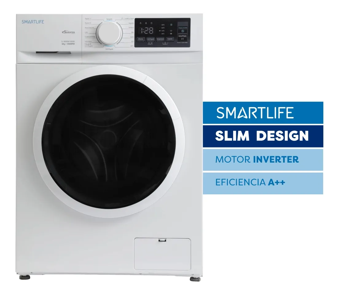Con una capacidad de 6kg y diseño Slim de tan sólo 40cm de profundidad, 59.5cm de ancho y 85 de alto, ideal para hogares modernos. Su motor con tecnología Inverter de alta eficiencia con clasificación energética A++, asegura menor consumo eléctrico y mayor durabilidad.