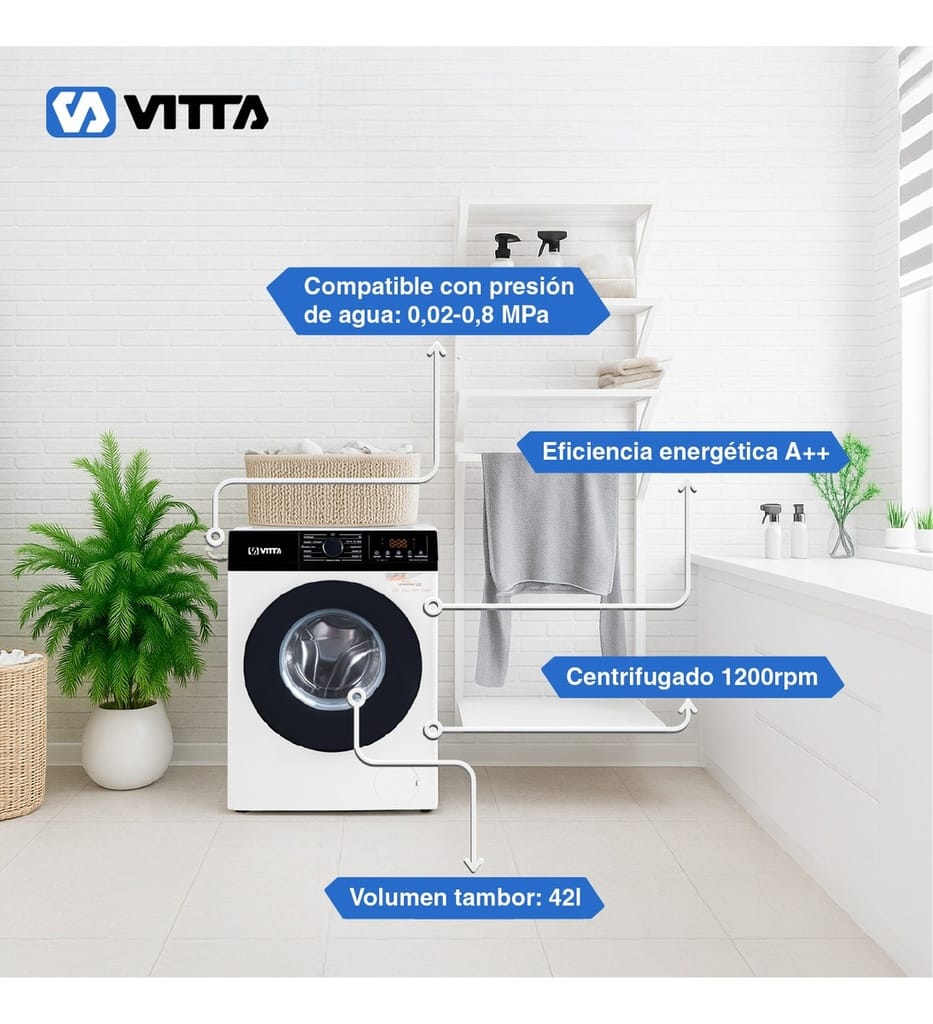 El Vitta Inverter 6Kg es un lavarropas de carga frontal diseñado para brindar eficiencia y cuidado en cada lavado. Su tecnología inverter optimiza el consumo energético y reduce el ruido, ofreciendo un funcionamiento más silencioso y prolongando la vida útil del motor.